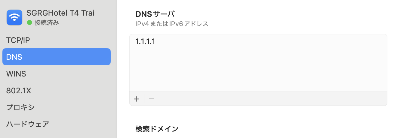 またDNSを 1.1.1.1 (Cloudflare)などのオープンな DNSに変更することで安定しました。となると、ホテルのルーターのDNSサーバーが不安定ってことでしょうね。